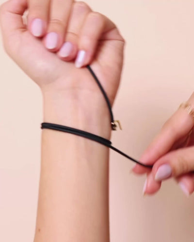 Your 18K Kufi initial hangs on a sleek magnetic bracelet, available in Black or Bordeaux.